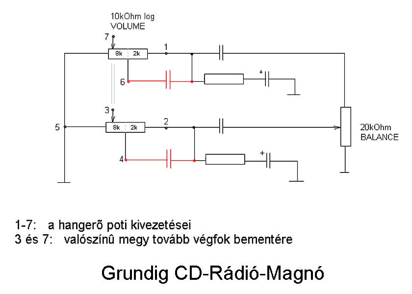 Van egy Grundig CDs-Rádiós-Magnóm és a hangerő potija "halk" állásban igencsak röcsög. Kontaktspray nem sokat segített rajta, bár így szétszedve nem látok rajta oxidációt. Tehát ki akartam cserélni, vettem sztereo, logaritmikust, 10kOhm-ost. Mikor kiforrasztottam az eredetit, látom hogy 7 lábú, 1 raszterre épült. Megfejtettem a belsejét és lerajzoltam ide nektek. Természetesen ilyen potit nem lehet kapni már.