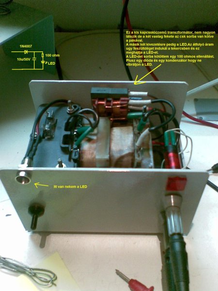 Neked nagyon melegszik az ellenállás?Nekem nagyon pirul! Mondjuk az 5 W-os volt nincs 10 W-os ellenállásom. 2 db 1 ohmos ellenállást kötöttem sorba. De! Mi lenne ha csinálnánk egy áramváltót? Sorb kötnénk a pákával egy pár menetes tekercset. Ugy működtetnénk mint egy transzformátort. Kapcsolóüzemű transzformátorral szerintem meg lehet biztos hogy működik. Annyi feszülséget biztos indukál rajta. Képet mellékeltem hogy gondoltam. Mi a véleményetek?