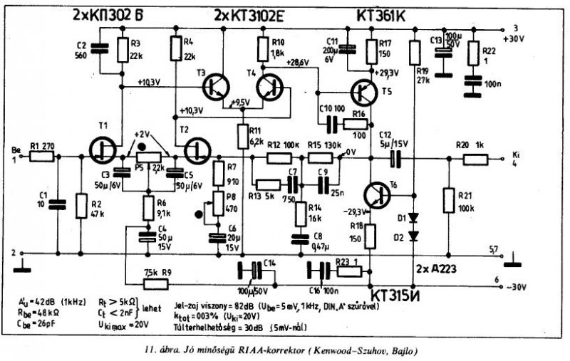 Kop-kop! Az, hogy egy rendszer torz, többféleképp is meg lehet akadályozni. Az első a negatív visszacsatolás. A másik az, hogy a bemenő jelnél sokkalta nagyobb tápfeszültségeket alkalmazunk. Ekkor az átviteli karakterisztika nonlinearitása nem szól bele annyira, mivel a bemenő szakaszon csak kicsi részt vesz igénybe. HA lejjebb engedem a tápfeszültséget, akkor arányosan nagyobbat "kér" a vezérlőjel. Az meg termeli szépen a felharmonikust, azaz a torzítást, mivel a bemenő-, és transzfer karakterisztika koránt sem lineáris. Nem véletlen, hogy annó a szovjet irodalomban publikált kapcsolás plusz-minusz 30 voltról, azaz 60 volt tápról járt. A HFM-1 is 32 voltot kér enni. Jó RIAA csakis nagy és jól szűrt tápfeszültséggel képzelhető el.