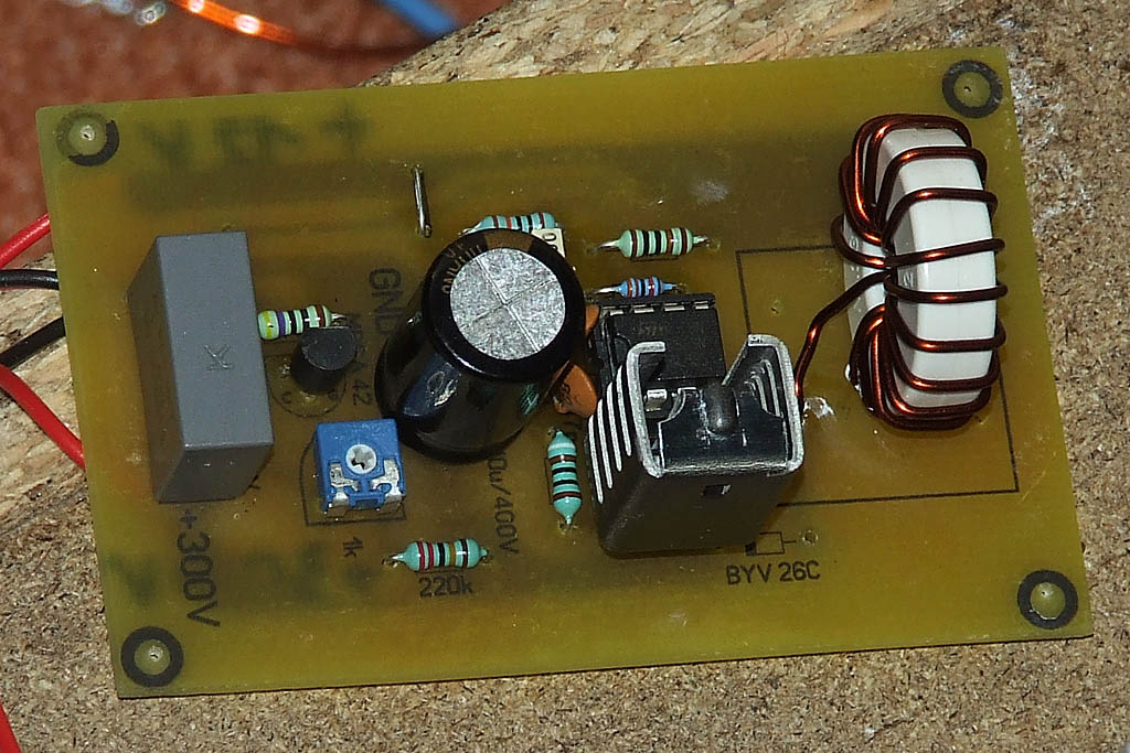 Elvégeztem egy újabb anódtáp kisérletet, ezúttal egy 12V-ot 300V -ra alakító egyszerű kis kapcsolótáppal. Az eredmény nagyon pozitív, a brumm minimálisra csökkent. Aki pl csöves efektet készít, annak mindenképpen érdemes kipróbálnia. A rajzot Mackomestertől kaptam, köszönet érte Íme: