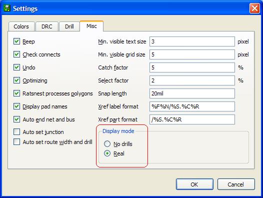 Ehhez nem kell semmilyen ulp. A mellékelt ábrán a piros kerettel jelölt részen a két rádiógombbal választhatsz, hogy a padeken legyenek furatok vagy teljesen ki legyenek töltve. A párbeszédablak egy megnyitott board Options - Set... menüjében hívható elő. A képen látható beállítás szerint (Real) a furatok megjelennek a padeken, a No drill, pedig angolul is azt jelenti, hogy furat nélkül.