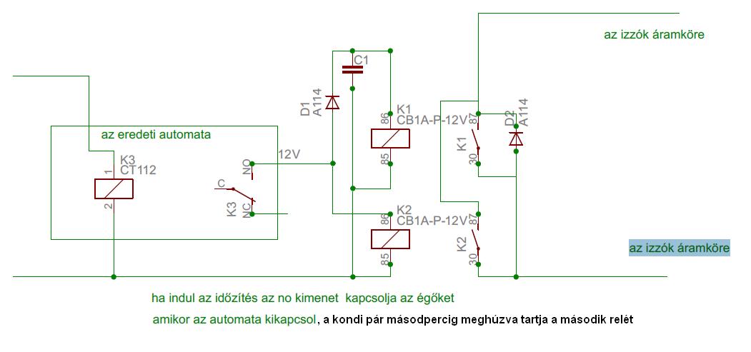 Nos kisérleteztem de a relé nagyon rövid ideig van meghúzva és nagyon berregő hangot ad a relé próbálkoztam egészen 20 Mf kondival is aminek már egészen nagy a terjedelme. ellenben egy darab különálló időzítővel (elszívó ventillátor) időzítőiből állítottam össze amit még külön reléznem kellett. Mindkét időzítő egyszerre indúl de a második időzítőt hosszabra álítottam.még nem tökéletes az összeálítás de ha egyszerűsíteni még lehetne akkort szivesen kipróbálnám.Melékkelek rajzot a megépítésről.Esetleg ha van egyszerűbb ötlet akkor szivesen veszem-