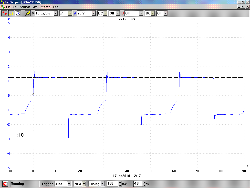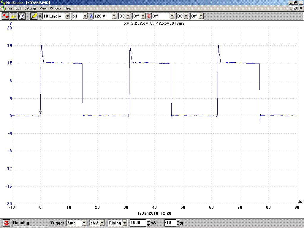 Közben csináltam tesztet a szilikonos litzével tekert meghajtótrafóval. A görbék szépek, a feszültség is pont jó. Szkópon is szép szimmetrikus, és mérve is a szokásos 5.93V és 5,94V