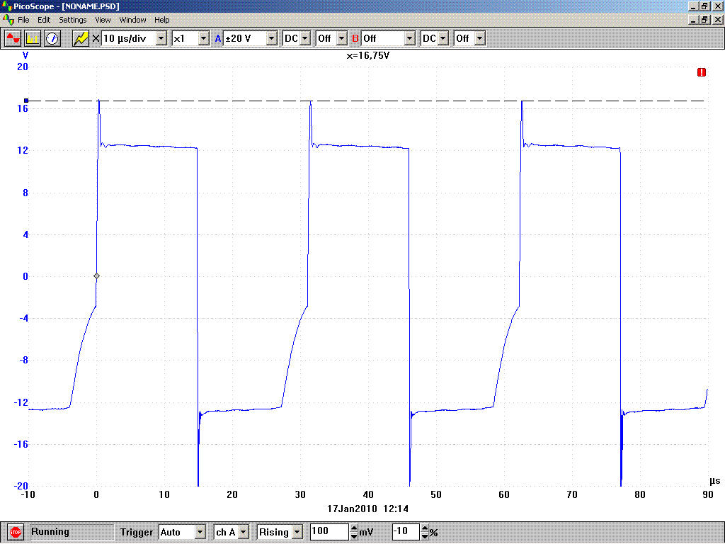Vasmag adatok: E25 M198a 0.25*2 a hozzá tartozó E25/7,5 1kamrás csévével. Huzal: 0.3mm lakk+selyem (vagy pamut, sajna nem tudom melyik) +akrilán lakk impregnálás menetenként) Felépítés a szokásos "Maci"féle négytekercses, de a 2-3 tekercs huzal-huzal mellett tekercselve). Menetszámok: 1 és 4: 35menet 2 és 3 36menet meghajtóoldali zenerek: 13V+4.3V sorban (feszültségre válogatva, sajna másra nem tudom) Tápfesz: 12.3V Feszültségek a multiméteres méréssel 2 tekercsen:5.92V 3.tekercsen:5.93V jelalakok. a képeken