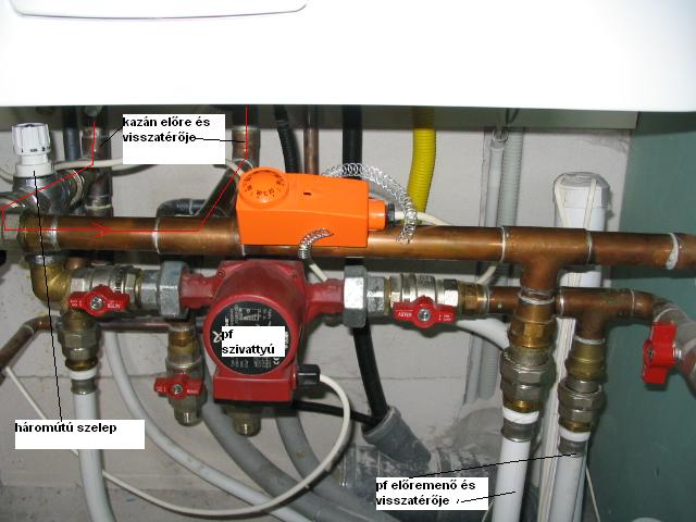 Csináltam egy skiccet a bekötésről. Ha nem jól látnám, akkor javíts ki! Az a fekete "bigyó" az motoros szelep volna? Nem látszik jól a bekötése sem. A többi kötés is nehezen kivehető ebből a szemszögből. Első ránézésre a padlófűtés részesül előnyben, mert a radiátoros leágazás előtt a három útú szelep vissza is fordítja a kazán visszatérőjéhez a vizet. Annak a sönt ágnak vékonyabb csövet szoktak beiktatni. ....de majd jönnek a többiek is és megnézik mit tehetnek.