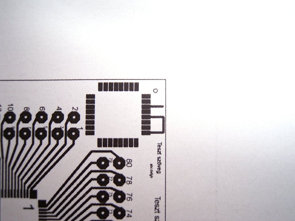 Bejöttem nyomtatni valamit, hogy kipróbáljam. A lézernyomtatómmal eddig kb. 15 oldalt nyomtattam, Karácsony előtt vettem, tehát még új. A NyÁK tervben az egyenes vonalakat mindig hullámosan nyomtatja ki, a görbéket (pl. betűk) viszont szépen kinyomtatja. Vajon miért ilyen hullámos? Nem hiszem, hogy azért mert koszos lenne, hiszen most vettem. Eddig nem volt zavaró, de most, hogy áttértem az SMD-re, már nem túl jó.