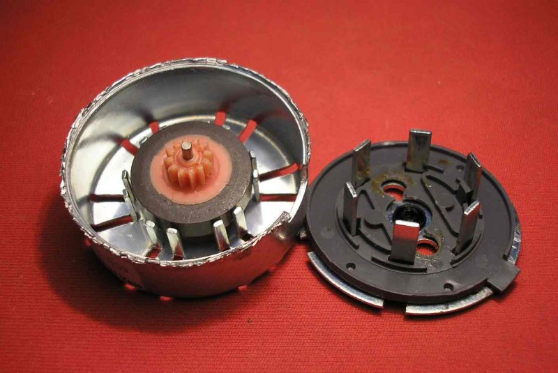 Egy ilye motort nemrég szedtem ki egy már (sajna) rossz laminátorból. A motor szétszedett állapotáról néhány felvétel. A tekercs csak két kivezetéses volt. Belül, a forgómágneshez az egyik végén szemben, két kis mü.a. fogaskerék kapcsolódottt, amelyek csak az egyik irányban engedtég elindulni a motort.