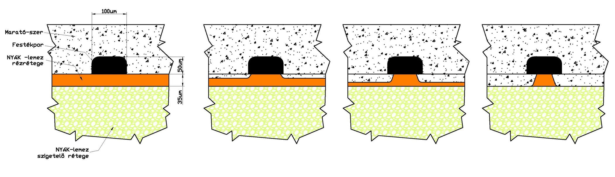 Én is lerajzoltam, szerintem miként alakul a vezetősáv keresztmetszete. Láthatod, a dolog simán működhet. A rajz arányos a "um"=mikrométer. Tehát valóban van oldalirányú maródás is, de az nem olyan, mint amit te feltételeztél. Nem is lehet, hiszen a maratószer gyakorlatilag minden irányban közel azonos sebességgel mar. Értelem szrűen, 70mikronos rézrétetgnél még jelentősebb a keresztmetszet vesztés, de az alján közel meg van ott is a 100um-es szélesség, csak a teteje "hegyesedik".
