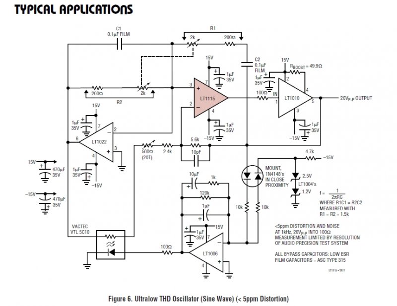 Szeretnék épiteni ultra-alacsony torzitású szinuszos oszcillátort. Ha lehet, 0,2% alatti legyen a torzitása. Szeretnék egyet, ami hangfrekis tartományban működik (szabályozható), ill. egy fix frekiset 50kHz környékén. Vanvalakinek tapasztalata/kapcsolása? Segitségeteket előre is köszönöm!