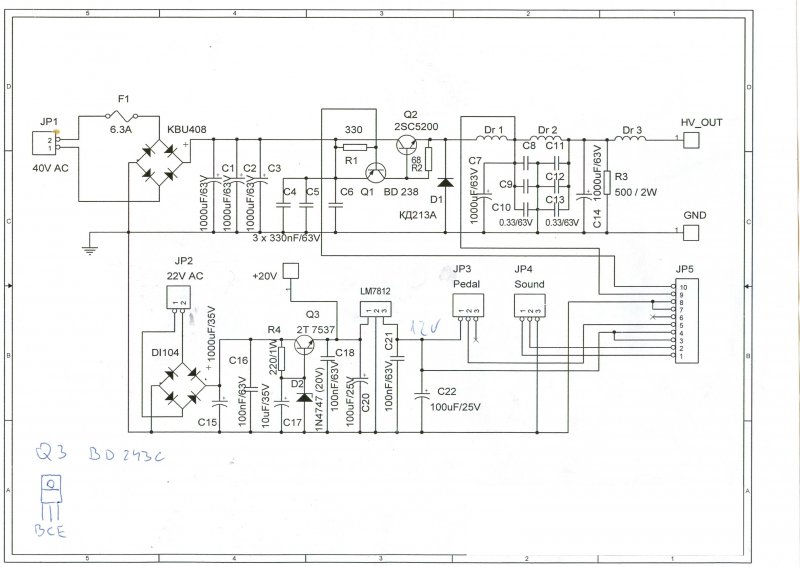 Jó lenne tudni, mi és hogyan kapcsolja be a Q1 tranyót. De megvédeni a Q1-et, csak úgy lehet, ha korlátozod a bázisáramát. Ha a tápot úgy kapcsolja be valami, hogy a JP5 csati 10-es lábát valami a GND-re húzza (vagy valamely olkból oda kerül a GND), akkor sajnos R1 leég, Q1 bázis-emittere megszakad. Tegyél sorba a JP5 10-es lábával egy 2,2kohm-os ellenállást. Akkor a BD238-nak legfeljebb 22mA bázisárama lehet. Persze akkor az 2,2kohm-on ez 1,1W-ot jelent, tehát egy 2W-os ellenállás kell. De probléma lehet akkor is, ha pld. ha Q2 kollektor köre kontaktozik, vagy megszakad. Ebben az esetben, a Q1 fogja az összes terhelőáramot vinni. Ha Q1 feltüzelődik és kollektor-bázisa zárlatba kerül, leéghet 0z R1 ellenállás. Sőt az is, ami a JP5 csatlakozó 10-es lábán a másik oldalra csatlakozik. Persze ez csak fikció.. üdv! proli007