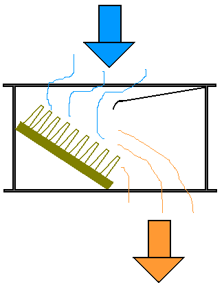 A szívótorokban is kb. 90 °-os irányváltást szenved el a légáram, közben egy része ívelt pályán halad a fűtőbetét pálcikái között (felül be, oldalt ki), viszont erősen rásegít a szívóhatás. A te esetedben ez utóbbi elmarad, ezért kellene úgy beszerelned a betétet, hogy a pálcikák lehető legnagyobb felületét érintse a mozgó levegő. Szerk.: most látom a vázlatot, a jobb oldali légáramnak sokkal könnyebb dolga van, a kilépő levegő zömét ez adja - fűtetlenül. Persze, mindenhez, amit leírtam, hozzá kell tennem: szerintem.