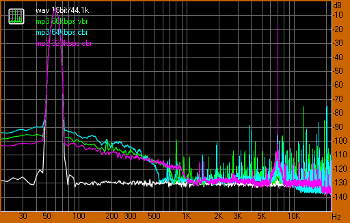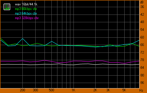 Közben én is kicsit utánanéztem hogy mit is művel az mp3. Egy mérőjeleket tartalmazó WAV fájlt kódoltam különbözű bitsűrűségű mp3-akba, egyik közülük VBR (változó bitráta) a másik kettő CBR (konstans, állandó). Ezek a kódolás alapbeállításaival kapott értékek, amikor a "Quality" kapcsoló normál állásban van. Ettől függ, hogy mennyi ideig elemzi a fájlokat tömörítés közben, tehát az átkódolás időtartama/számításigénye változik.