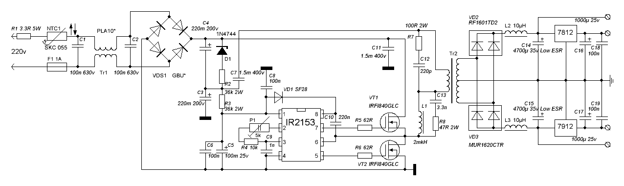 A szekunder 12v-os ágakat diódákon keresztül összekötöttem. A diódák mellett nincs semmilyen RC-tag. Így terheletlenül kb 20mA fogyaszt, ami nem kevés, de így elsőre egyáltalán csoda hogy működik. A fetek terhelve se melegszenek. Egyébként 2SK2847 a típusuk nem úgy mint a képen van.