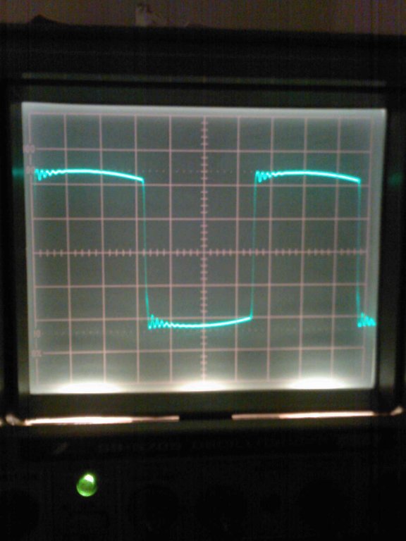 Nah, megvan a bunos... Gyanakodni kezdtem a tularamvedelem FET-jere, mivel kicsi helyett valami IRF sorozatut tettem bele (megintcsak ez volt alapon...). Lass csodat, a freki rogton fel is ugrott, miutan kidobtam a FET-et potival egyutt! Tehat elbabralta a rezgokort rendesen. Bassmester szerint a tularam-vedelemnek igazabol nincs sok jelentosege, mivel fixen egy vegfokot fog taplalni es olvadobiztivel jol vedheto. Ami meg valtozott az az, hogy a pufferfesz 2x55V kornyeken van, tehat mintegy 6-7V-ot emelkedett oldalankent, a mag 25 perc utan is csak alig kezmeleg. Csak a segedtap ellenallasai futenek, de majd leszedek egy menetet a tekercserol. Itt egy foto a mostani jelalakrol, ugyancsak a szekunder egyik tekercse. Beallitasok: 20V/div. es 5uS/div. Az aramvalto meg benne van, lehet, hogy az okozza ezt a berezgest? Mindenesetre koszonom mindenkinek a segitseget, lassan elmondhatom: kesz az elso rezotapom