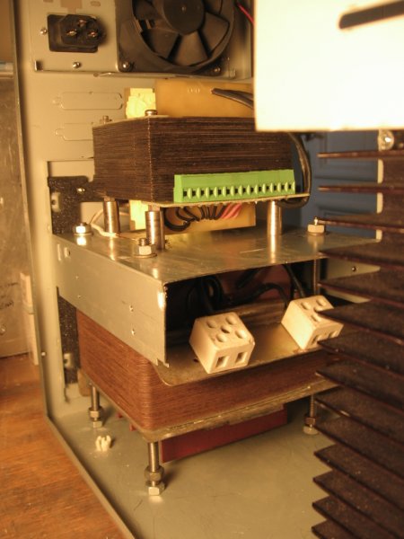 Ezek még félkész állapotot tükrözik, bár a feliratozás még nincs kész most sem. Nincs ötletem se hogyan csináljam. Mivel az előlap egy nyomtató oldalából lett kivágva, ezért olyan a felülete, mint a ház eredeti elejének(amolyan rücskösféle műanyag).Nem akarom elrondítani azzal, hogy ráragasztok valamit. Csak azt nem tudom a feliratok hogy fognak rákerülni. 0 Forintos projectnek indult(persze nem az lett), ezért szinte mindent itthoni dolgokból készítettem. A legnagyobb munka a trafók megtekerése volt. Külön választottam 2 trafóra a dolgot. Egyikre került csak a 2*35V. Másikra a többi: 4*6V, 4*15V, 1*12V.