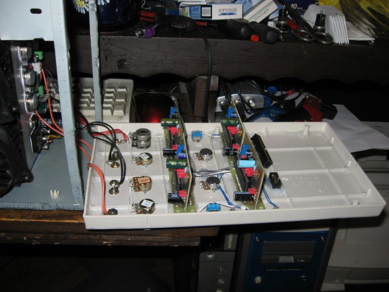 Ezek még félkész állapotot tükrözik, bár a feliratozás még nincs kész most sem. Nincs ötletem se hogyan csináljam. Mivel az előlap egy nyomtató oldalából lett kivágva, ezért olyan a felülete, mint a ház eredeti elejének(amolyan rücskösféle műanyag).Nem akarom elrondítani azzal, hogy ráragasztok valamit. Csak azt nem tudom a feliratok hogy fognak rákerülni. 0 Forintos projectnek indult(persze nem az lett), ezért szinte mindent itthoni dolgokból készítettem. A legnagyobb munka a trafók megtekerése volt. Külön választottam 2 trafóra a dolgot. Egyikre került csak a 2*35V. Másikra a többi: 4*6V, 4*15V, 1*12V.