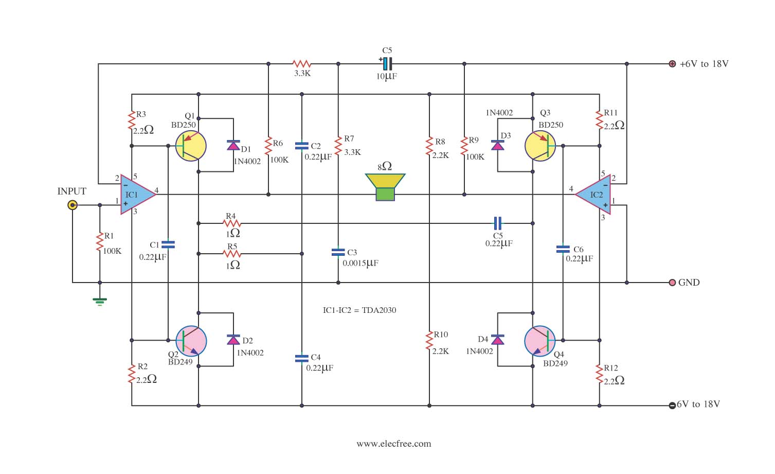 Mivel az IC hidalásra nem lett kialakitva, szükséged lessz egy ilyen fázisforditó kapcsolásra. Pl. erre( felső rajz, Figure 1):Bővebben: Link