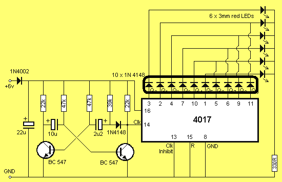A bekeretezett 10-ből 8 darab diódás VAGY kapu. Két-két IC-kimenetet kapuz egy-egy LED-re. Ha nem lennének, akkor a kimenetek tönkremennének a rövidzáraktól.