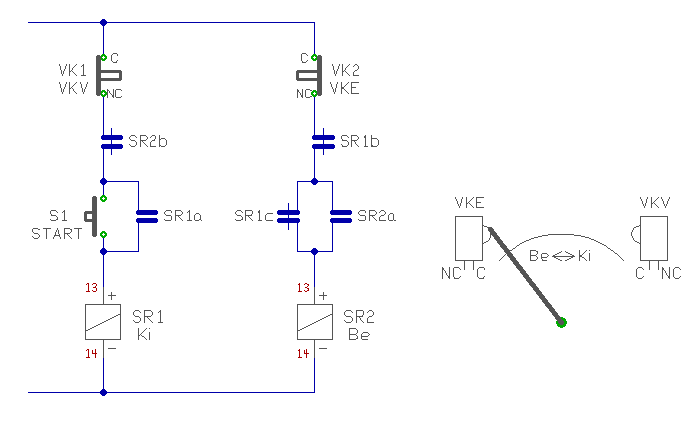 Amikor elhagyja VKV végállás kapcsolót, VKV zár. De ilyenkor, SR1 nem képes meghúzni még akkor sem, ha a START gombot megnyomjuk, hiszen SR2B érintkező bontva van.