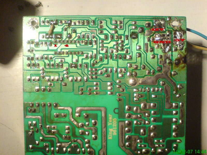 Szerintem vágd el a fóliát az IC 1-es lábánál. Ezután tegyél egy pot.métert a majdani** pozitív kimenet, és a föld közé, a középső kivezetése pedig az IC 1-es lábára csatlakozzon.