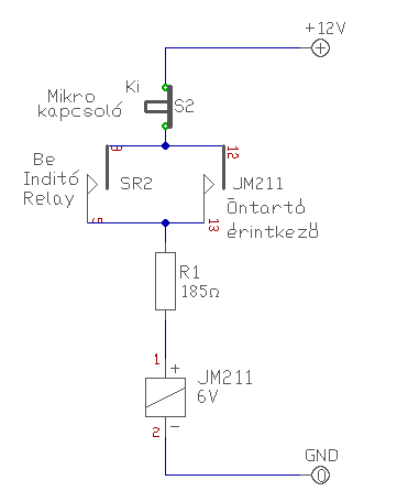 Szerintem nem olvasol figyelmesen. Meg írtam, hogy itt az általad kért működésű áramkörök vannak, csak éppen egy rajzlapon. De megrajzoltam úgy a hogy működtetni szeretnéd. (A relédről nem találtam semmit a hálón) - Az SR2 jelű záró érintkező a másik relé, ami indítja (bekapcsolja a JM211-es relét. - A Ki gomb a mikrókapcsolód bontó érintkezője. Remélem így már érthető. - 185Ohm-os ellenállást persze nem fogsz találni, közelítő értékűt kell keresni. Ezek szerint a relé, 32mA-es. 180Ohm/0,6W-os ellenállás bőven megteszi. üdv! proli007