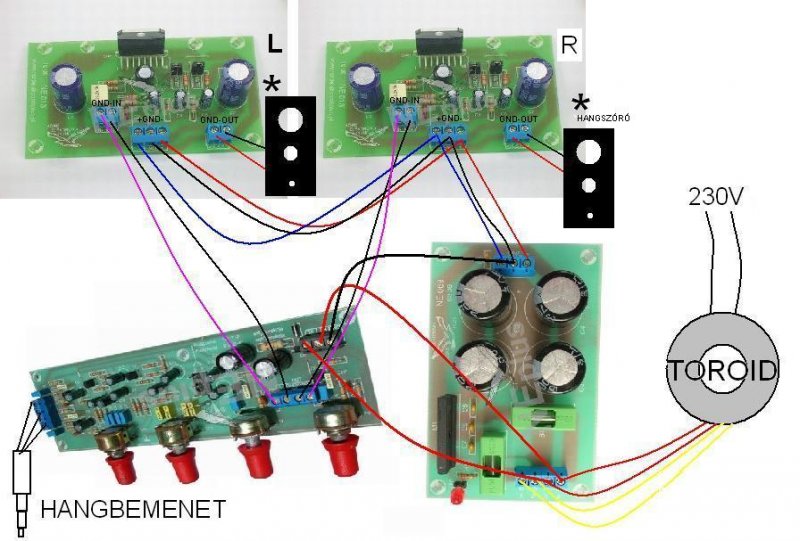 Szerintem az előfok bekötésed alapjaiban hibás. Azt is oda kéne kötni ahová a végfokokat kötötted. Tipusokat tudsz írni a panelekre? ezek ha jól látom KIT-ek lennének.