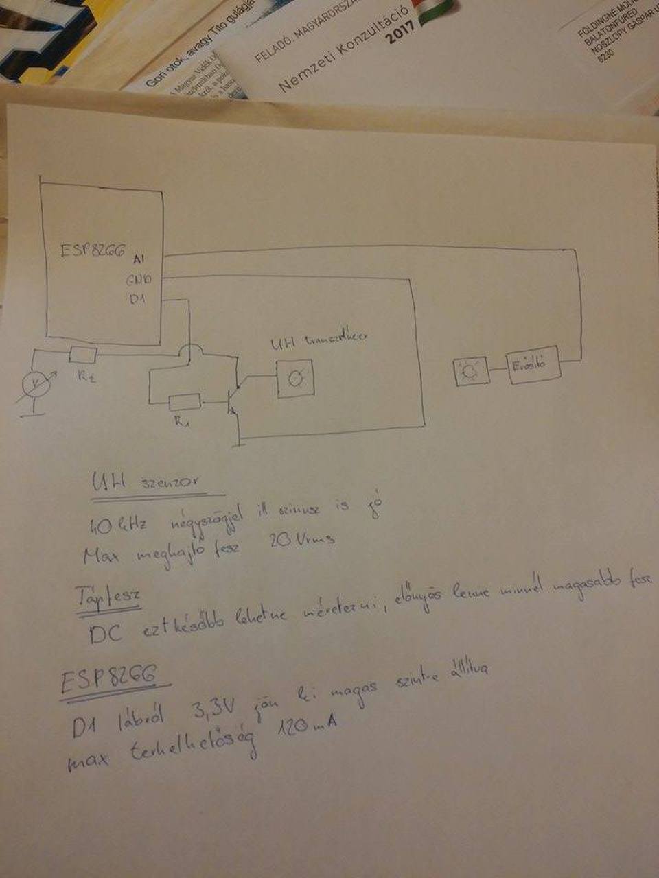 Tudom nem szeretitek, ha valaki így teszi fel a kérdést ahogy én fogom, de mivel nagyon nem tudom mi tévő legyek, bízok segítőkészségetekben. Megakadtam, az ultrahangos szenzorom meghajtásával. Az ultrahangos szenzor 40kHz-es jelet igényel, amit a jel amplitúdójának maximalizálása miatt a megengedett legnagyobb feszültséggel kellene meghajtani. Az adatlapba 20Vrms-t írnak. (Prowave 400ST120) Leteszteltem, elfogadja a négyszög illetve szinusz jelet egyformán. A csatolt képen próbáltam összefoglalni az elképzelésemet. Úgy gondoltam, hogy a mikrokontroller D1-es lábát kapcsolgatnám 50%-os kitöltésű tényezőjű PWM jellel, ami 0-3.3V-ot tud kiadni. Ahhoz, hogy ne terhelje nagyon a mikrokontrollert a kapcsolás, szerintem kell bele egy védőellenállás amit R1-el jelöltem a rajzon. Ha jól tudom, a maximális áram ami nem okoz kárt a kontrollerbe az 192mA (drive capacity current 192mA, sink current 20mA). A tápfeszültség egy DC tápforrás lenne, amit a tranzisztor kollektor ágába kötnék. Ha a tranzisztor megkapja a feszültséget a kontrollertől, akkor ki nyit és földre húzza a tápfeszt. Ha jól gondolom ide is be kellene építeni egy ellenállást, hogy a tranzisztoron ne folyjon keresztül túl nagy áram. A segítséget az ellenállások méretezésében szeretném kérni, illetve a tranzisztor kiválasztásában. Esetleg ez a tranzisztor lehet FET is. Illetve tisztázni, hogy jó úton járok -e. Sajnos képzésem során nem szereztem túl nagy tapasztalatot áramkör tervezésben, tipikus megszokott elméleti dolgokat tanultam csak. A másik kérdésem a másik oldalon lévő jel feldolgozása kapcsán lenne. Ha túl nagy a távolság akkor a mikrofon által generált feszültség alacsony, amivel a kontroller nem tud számolni. Így egy erősítő kapcsolással fel kellene erősíteni, egyelőre erre sincs ötletem, de egy egyszerű műveleti erősítős kapcsoláson gondolkodtam. Esetleges zavarások elkerülése érdekében valamilyen szűrőt is be kellene építeni. Előre is köszönöm válaszotok, elképzelésem skiccét csatoltam.