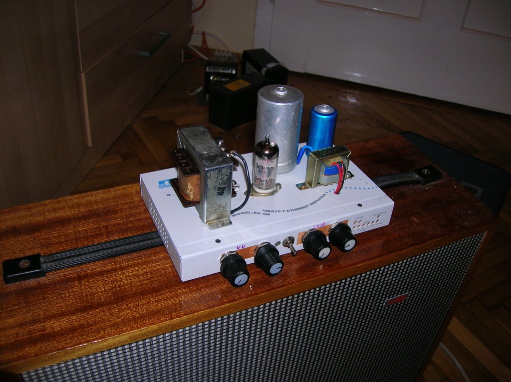 Ezen a héten fejlesztettem tovább a KR-5 Ethernet Repeater házba épített erősítőmet a következőképpen: Nem volt benne előfok. Az egész átalakítás hülyéskedésnek indult. Cső + TDA? ki hallott már ekkora marhaságot? Aztán szépen lassan, a tesztelések során rájöttem, hogy nem is rossz ötlet. Egész jó hangja van a kis erősítőnek. Elkezdtem rajta gőzerővel dolgozni, és a hét közepére kész is lett a KR-5 Ethernet Repeater erősítő V2.0 Hangerejét tekintve elegendő szobai gyakorlásra.