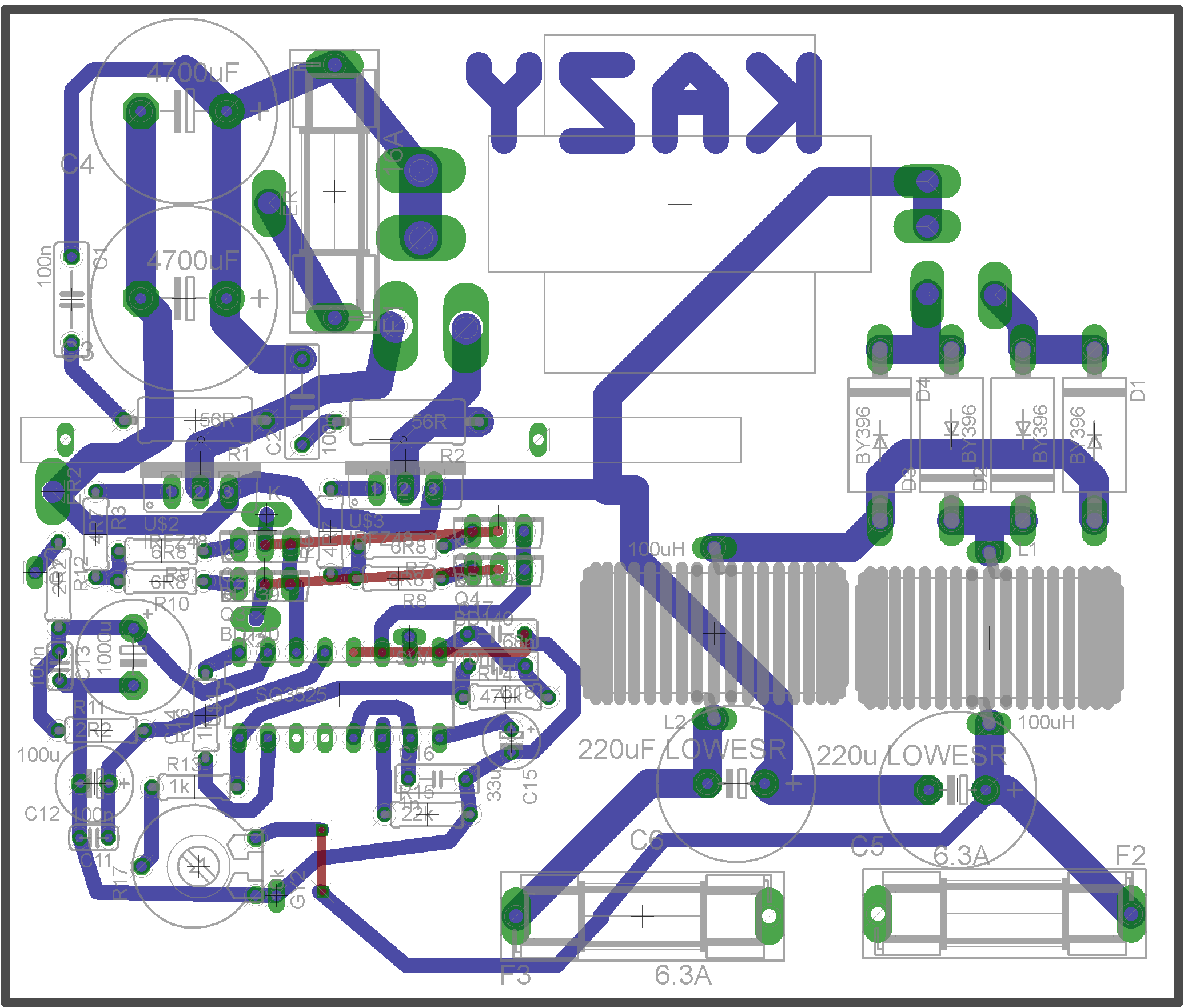 Holnap nekifogok a nyák kimaratásához és szép lassan az élesztéshez. Nem akarom elszúrni, úgyhogy először csak az oszcillátor részt rakom be, és méregetek mindenhol, hogy jó-e. De addig is szeretném, ha valaki ránézne a nyáktervemre, hogy esetleg hol kéne javítani valamit pl. a sávhosszúságon,-szélességen. A piros vonalak a forrasztási oldalon lesznek átkötésként odaforrasztva, illetve a nagy áramú sávok meg lesznek erősítve vezetékkel is.