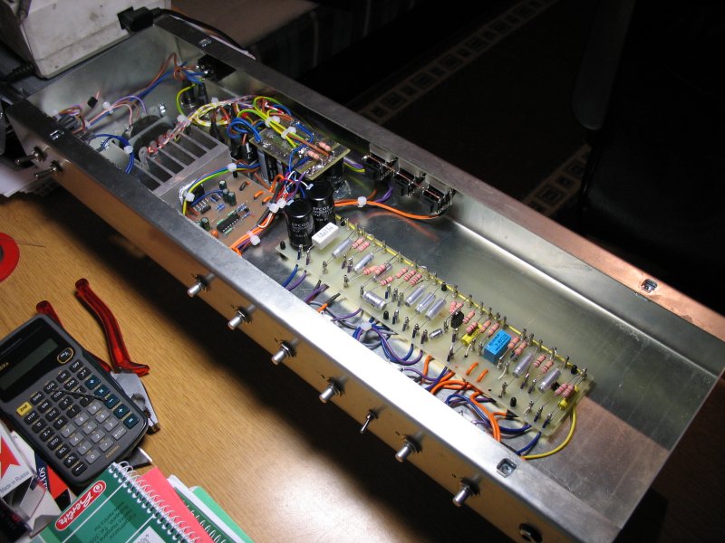 Jelenleg az elő és hátlappal kínlódok, a fóliákat is megterveztem, már csak meg kéne csináltatni, a héten megyek műbőrt venni, aztán ha minden jól megy, akkor a hétvégén talán lesz rá időm. Mostanában az előfokot nyúzom, kisérletezek vele, csöveket próbálok, kondikat cserélgetek... már körvonalazódik a végleges formáció
