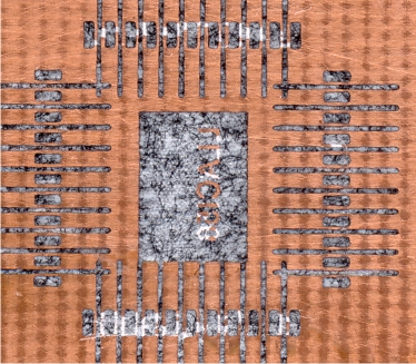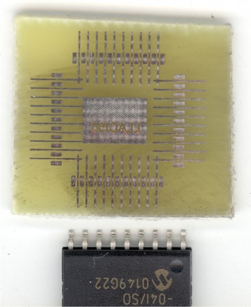 Persze jó ez játéknak, és sokat lehet tanulni belőle, de én nem hiszem, hogy a nyákkészítés ennyire bonyolult. Ha kezdőként elolvasnám ezt a rovatot, biztos, hogy valamilyen más, kevésbé bonyolult technikát keresnék. Én elsősorban a foto eljárást alkalmazom nyákjaim gyártásánál, de néha egy-egy prototípust – ha egyoldalas a panel, - le szoktam gyártani műnyomópapírral. Jó ez a próbaáramkör, mert egyúttal a nyomtatási rajzot is tesztelhetem. Eddig nem volt alkalmam kipróbálni finomabb rajzolatú nyákot a vasalásos / laminálós technikával, de régen piszkálta a csőrömet, hogy vajon tényleg elengedhetetlen egy lamináló átalakítása ehhez? Az én technikám a következő: 1. Bekapcsolom a laminálót és a sütőt. (A lamináló egy közönséges átalakítatlan lamináló.) 2. 3-4 perc után kiveszem a panelt a sütőből, és egyszer átengedem a laminálón a műnyomópapírral, amitől jól odaragad, (nem csúszik már el,) - aztán visszateszem a sütőbe. 3. Amikor a sütő eléri a 180 C fokot, a nyákot végleg kiveszem, és átengedem a laminálón megint egyszer, és már dobom is a vízbe. (Ezzel akár várhatnék is, de melegen sokkal gyorsabban ázik le.) Mivel ma kellett egy egyoldalas panelt csinálnom, és magam is kíváncsi voltam, rajzoltam egy MQFP tokot, minden láb között egy 5 mil-es (0,005 hüvelyk!) átvezetéssel, - gondoltam - elfér ez a másik munkadarab mellett. Feltettem a három képet mutatóba. Az első a rajzolat, a második a leáztatott maszkolt nyák, a harmadik pedig a kész panel. Nem erre a panelre figyeltem, mert nem ez volt a cél, ezt tényleg csak úgy „mellette” csináltam. Igaz, én nem csak a laminálót vontam be a munkába, hanem a sütőt is. Azt hiszem, hogy lehetne ez vasaló vagy rezsó is, ha 180 C fokra melegítjük vele a nyákot. (Tehát valamivel mérjük a hőmérsékletet.) Az eredeti vasalásos technikát alakítottam át fix hőmérsékletű átkopírozásra, és nem kézi hengert használok, hanem a laminálóval hengerlem a műnyomópapírt a panelra. De ezekből az eszközökből szinte minden adott egy háztartásban, és egy kezdő is tuti sikert érhet el velük.