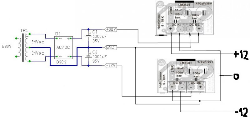 Bocs. Valószínűleg nem fogalmaztam érthetően. Tehát egy 2x25Vos trafót akarok egyenirányítani 1 graetzes megoldással. Majd ennek a +-35 ágából 2 db lm350el +-12Vot előállítani.