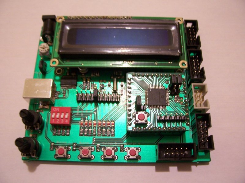 USB, SPI EEPROM, I2C EEPROM, hőmérő szenzor, 2 db potméter (A/D illetve komparátorhoz), DIP kapcsoló, LED-ek, nyomógombok, LCD kijelző. A kontroller I/O lábai pedig szallagkábeles csatlakozóra vannak kivezerve.