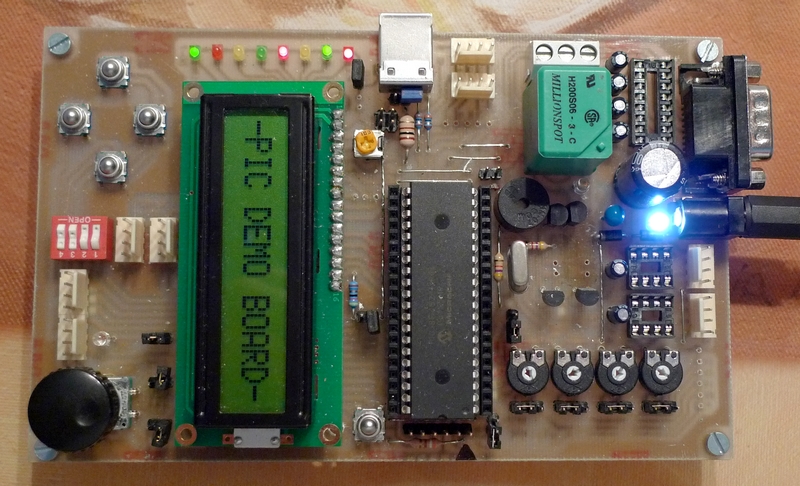(USB-s PIC esetén is), SPI, RS232, csipogó (sw-esen meghajtva), 2db induktívan is terhelhető tranyós kimenet, meg egy relé. Bármilyen dugasztápról (>7V), vagy USB-ről is táplálható.