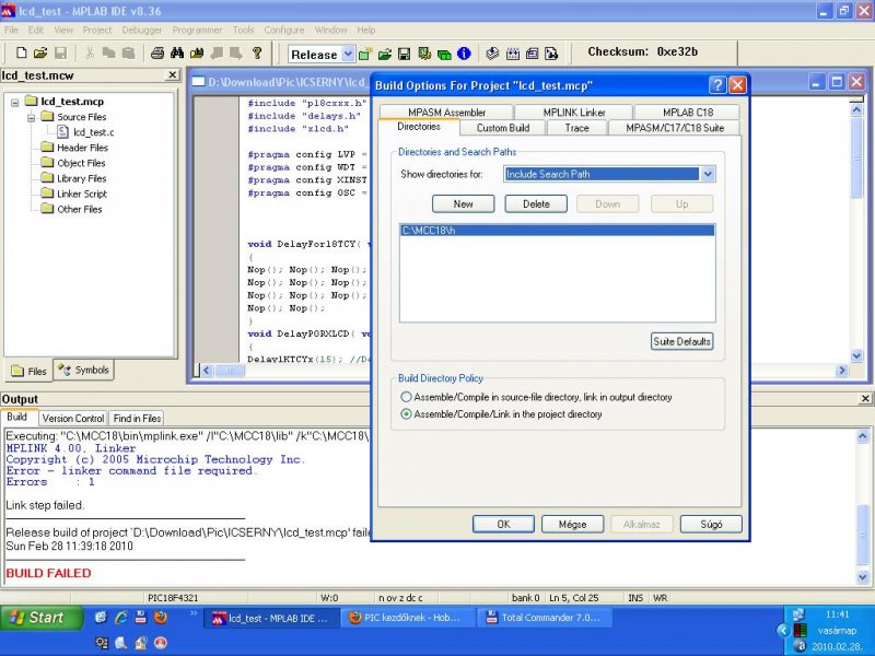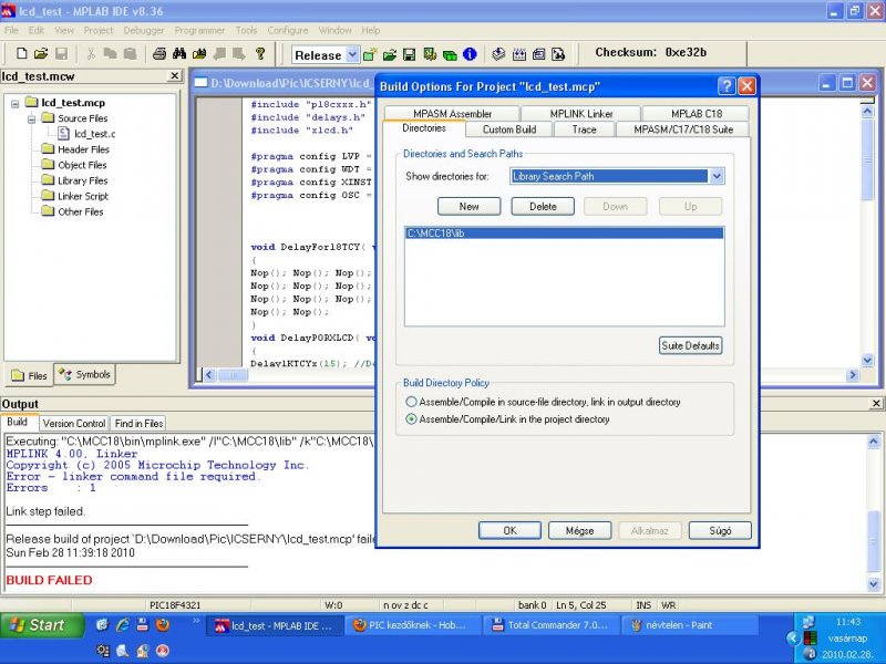 3. Ha a hiba megmaradt, akkor a Library Search path beállítása nem jó! Ahová mutat, abban a könyvtárban lennie kell egy p18f4321.lib nevű állománynak, abba van beépítve az eljárás, amit most a linker hiányol.