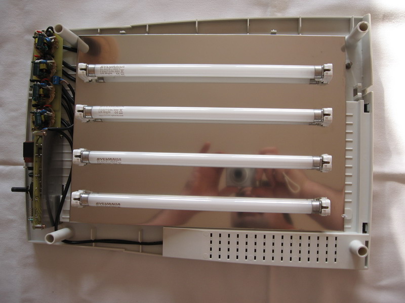 Elkészült az UV csöves levilágítóm, egy AGFA SNAPSCAN 1212 szkenner dobozába építve. Tartalmaz: 4db 8W-os T5-ös UVA csövet, 4db 9W-os kompakt elektronikát, és saját tervezésű időzítőt, ami 1-től 6 percig állítható egy 6 állású forgókapcsolóval. A levilágítási idő P20-as lakknál 2-3 perc. Videó