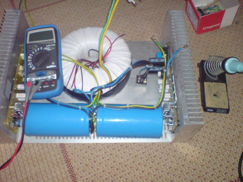 Igaz még nincs teljesen készen de majd hétvégén talán készen lesz ma csak teszt üzem volt, ez egy NMOS-350es végfok csak annyi különbséggel hogy nem a kapcsolásban szereplő IRFP450el csináltam hanem IRFP260as fettel és számításaim és méréseim szerint 550Watt ot tud 4Ohmon +/-75V ról Egy kép a Quad-405-ről amit már 6éve építettem és most lakkoztam újra a dobozt!