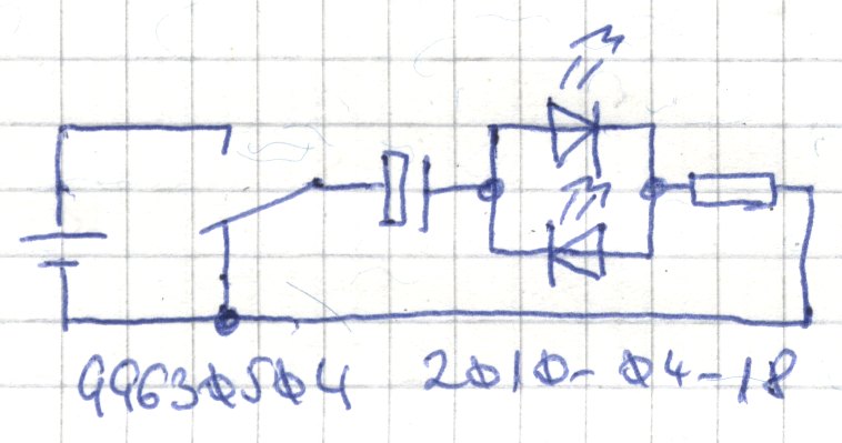 Lerajzoltam az kapcsolást, mellékeltem a képet. Még azt hozzátenném, hogy egy elko-t használtam és figyeltem a polaritásra, a negatív pólusát a telep negatív pólusára kötöttem. A led anódja pedig a telep pozítív pólusára került.