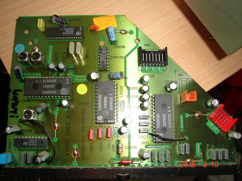 Kicsit (sokat) babráltam vele. Sajnos le ejthették vagy valami, a sorkimenő melett el van törve a panel amit javítottak. Átnéztem minden forrasztást, javítottam a gyanúsakat, látszólag minden jónak tünik. A hiba anyiban változott, hogy bekapcsoláskor, csak párnatorzítása van, de jó nagy. 10-15 perc alatt szép lassan mászik vissza, az utólsó kb 3 centit pedig vissza ugorja. Vajon még hol lehet a hiba?