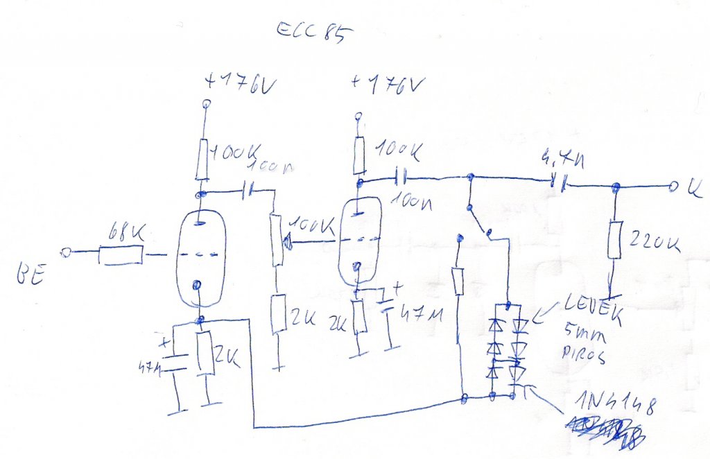 Miért nem teszel bele ecc83-at? A 85 nem igazán jó ilyen célra. Szerintem a 83akkal nagyon nagy hangzást lehet csinálni, 2db-al már a pokolok torzítása is előhozható. Mindenféle diódás nyavalya nélkül. Zsolti