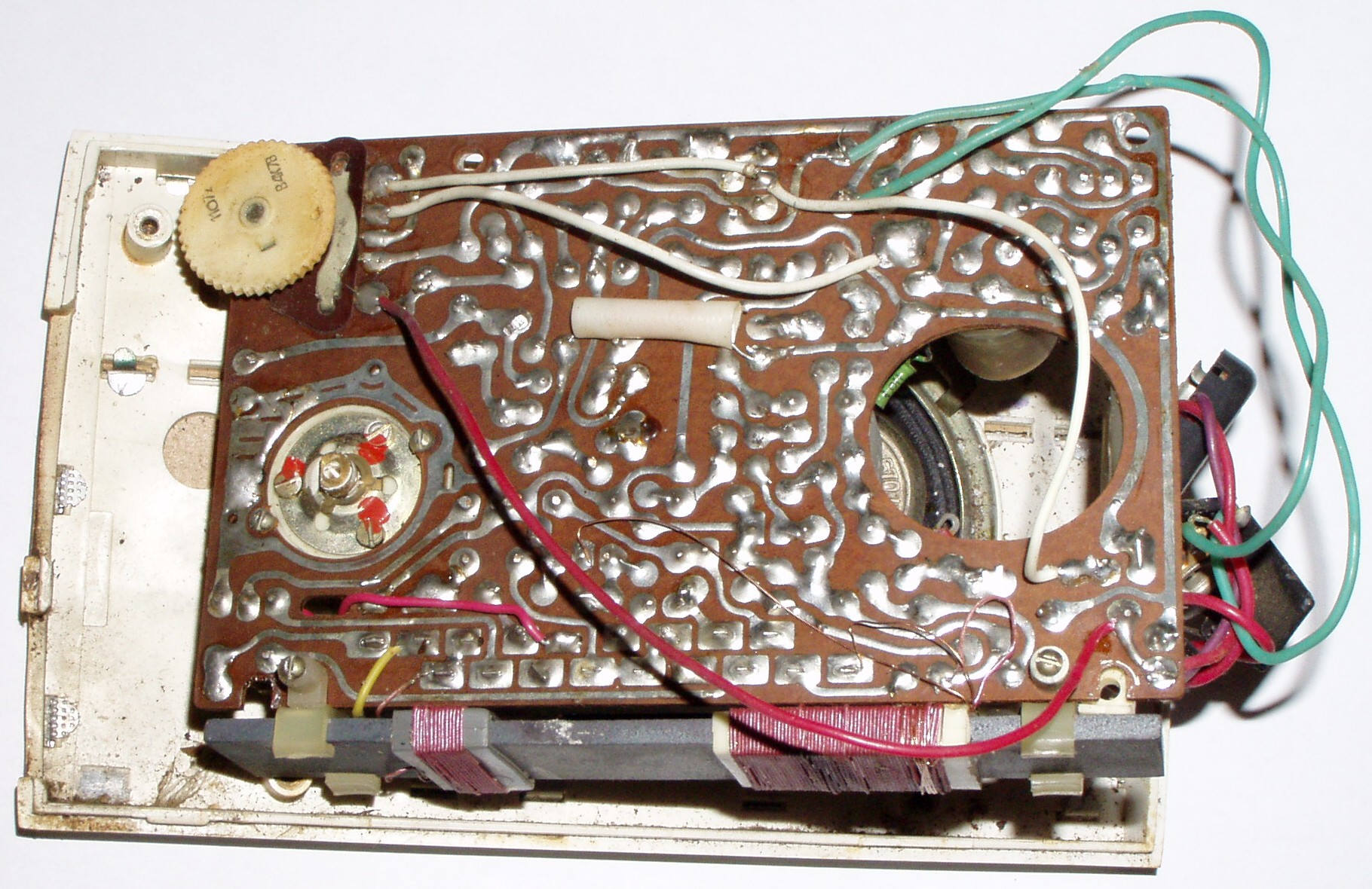 A hangszóró vezetékei (piros) először a fülhalgató csatira mennek innen két zöld vezeték megy a rádió alsó részének közepén lévő trafó (kimenő) szekunderére (jobboldali két lábára).
