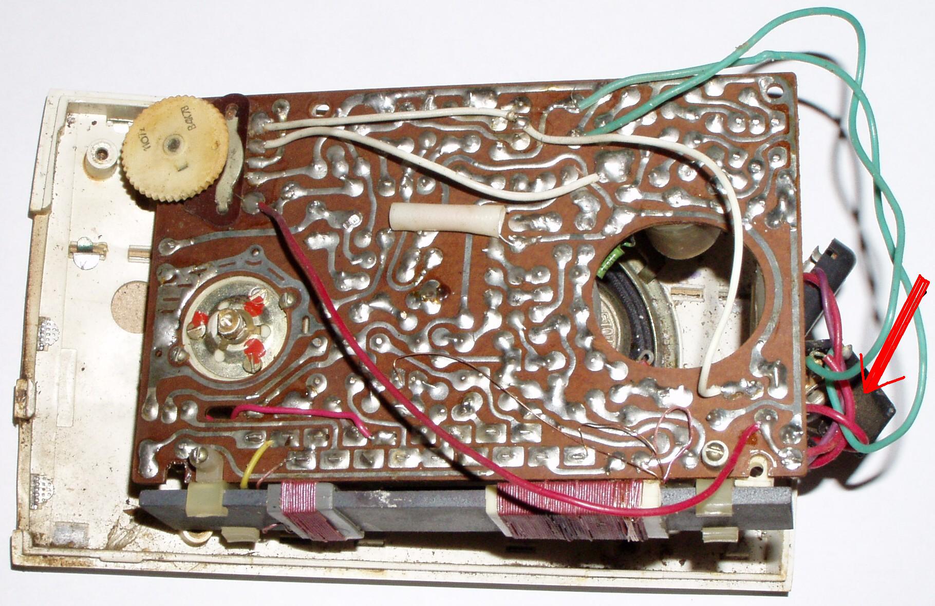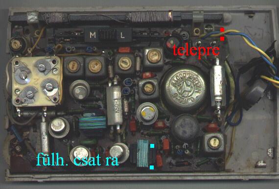 A hangszóró vezetékei (piros) először a fülhalgató csatira mennek innen két zöld vezeték megy a rádió alsó részének közepén lévő trafó (kimenő) szekunderére (jobboldali két lábára).