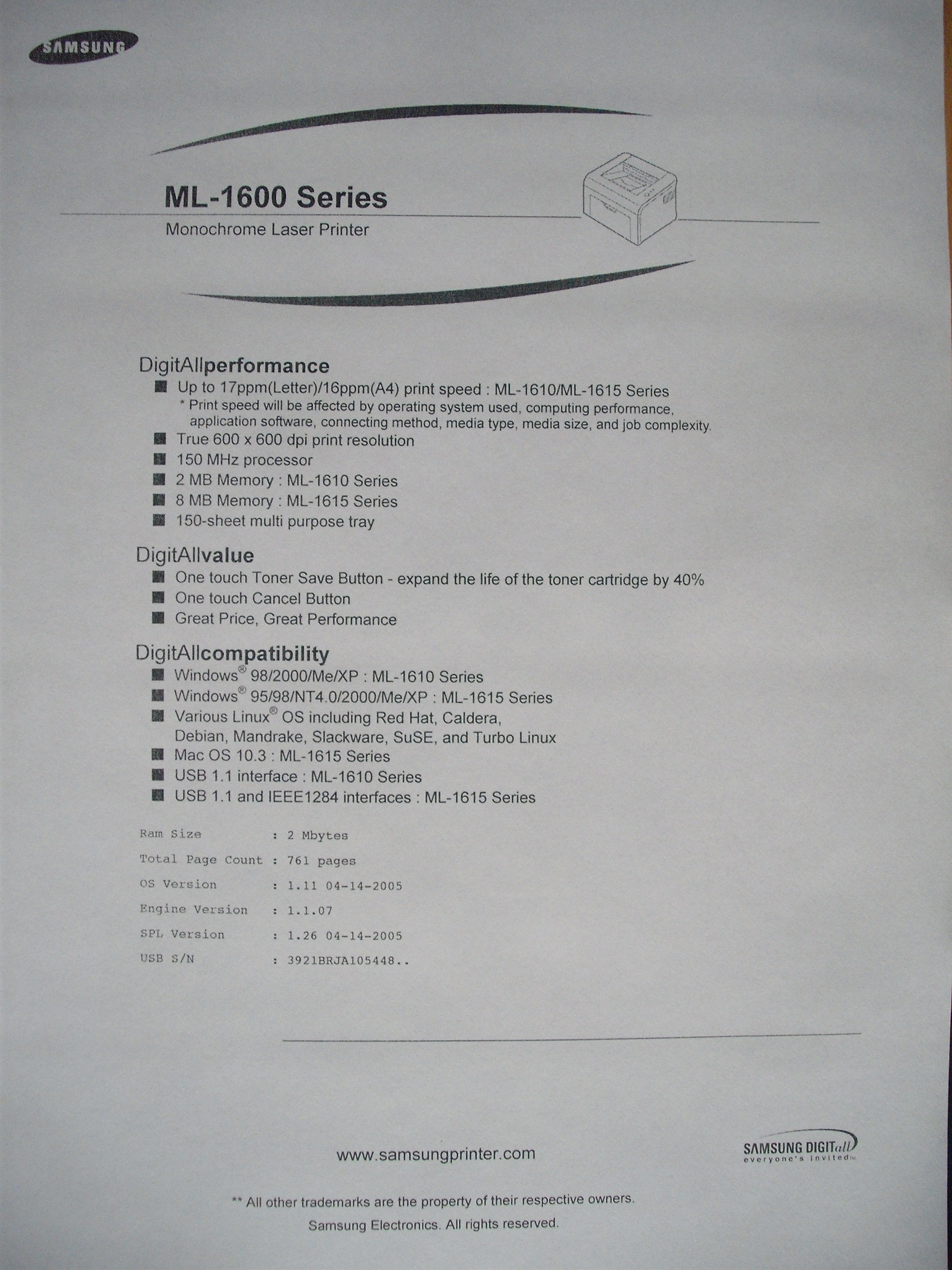 Valamilyen speciális menüben meg kéne nézni, hogy eddig hány oldal lett nyomtatva vele. Vagy esetleg diagnosztikai oldalt nyomtattatni vele, amely tartalmaz ilyen információkat. Samsung-nál nem tudom, miként lehet kivarázsolni ezt az információt.