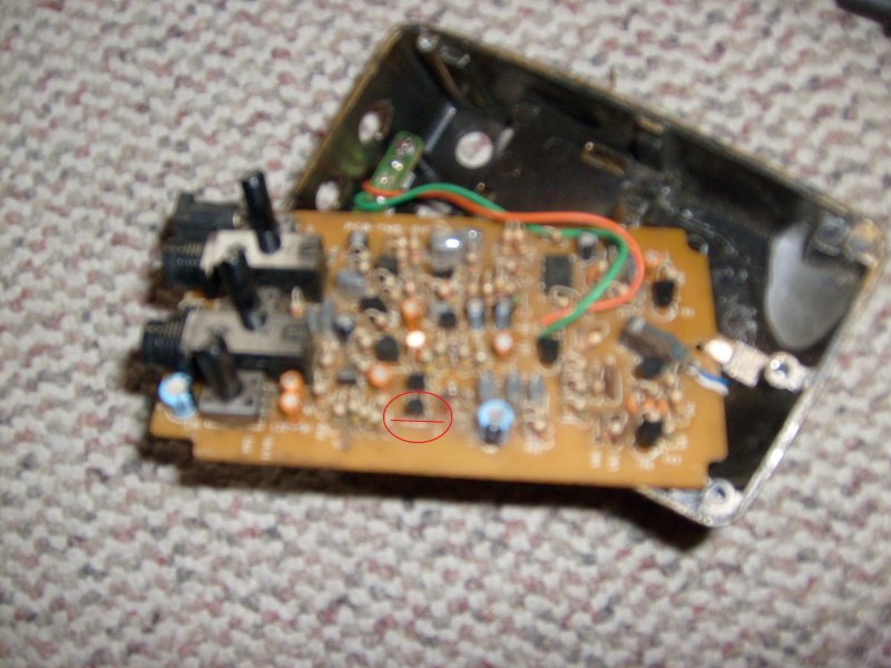 Az pedig egy NPN tranyó lesz. Igazából nem hiszem, hog csak úgy át lehett volna kötni, be kéne azonosítani a torzító típusát, aztán egy jó képet közelebbről előről és hátulról, alkatrész/forrasztás oldalról.