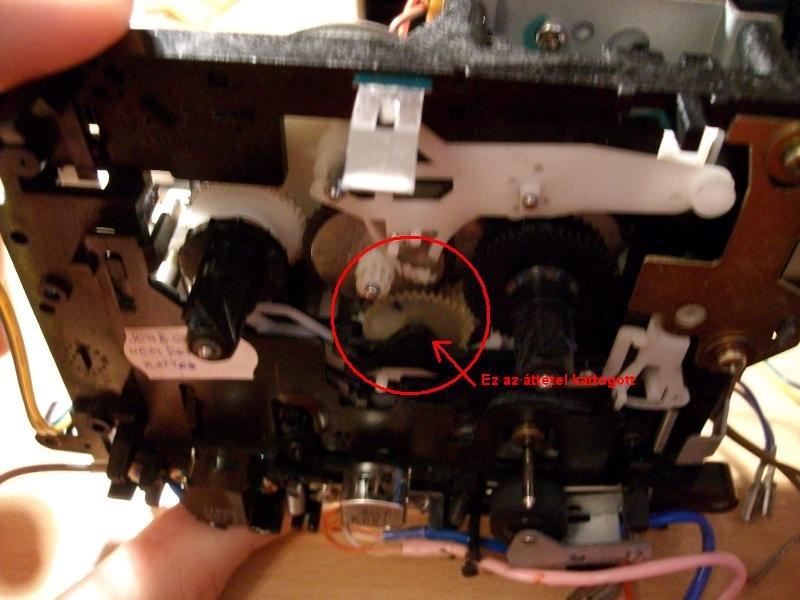 Nem a felső, fehér volt az oka, hanem az alsó, amit az a fekete műanyag kart tart (mondjuk a másik is kopott kissé). Az a kar emeli fel felvétel/lejátszás állásban, annak kopott ki a tengelye. A másik fogaskerék tekerésnél is forog, azzal eddig nem volt probléma.