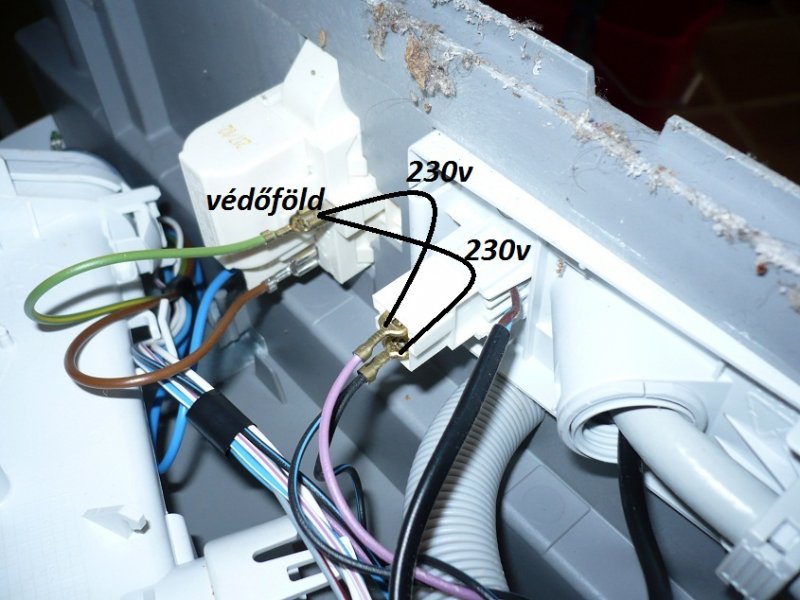 ha bekapcsoláskor itt feszültséget mérsz (230V, a képen nem egyértelmű, hogy mit mihez képest mértél, úgy tűnik, hogy a védöföldhöz képest, de nem ahhoz kéne, hanem egymáshoz, a 2 fekete vezetéken mérj), akkor a szeleppel van a baj. a 666-os képen van a mágnesszelep csatlakoztatása. húzd le az egyik sarut és mérj ellenállást a két kimenő vezeték között. 4K érték körül jó a szelep tekercse (ha egy tekercses). ha ez rendben van, akkor nagyon óvatosan, nehogy megrázzon, kapcsolj rá feszültséget. ha nem indul meg a víz, akkor nyisd ki a csapot