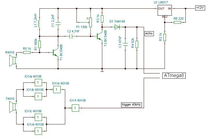 Szóval a megoldandó feladat pontosan: adott egy autó aminek a belső terét kellene figyelni ultrahang technikával. Ugye az autóban 12V van, ígyhát erről üzemelne a kapcsolás. Az AVR elé persze kell egy 7805 de az nem nagy cucc.. Viszont az UH adót tálán érdemesebb lenne meghajtani a 12V-ról. Illetve mint kiderült már, az nem is jó a plsz minus táp miatt. Az adó adatlapja 20 V vrm max-ot ir. És 40Khz-es négyszög jel kell neki. Ezt elő tudom állítani a Mega 8-el de nem tudom hogy lehet ezt megoldani hogy jó legyen az adónak.