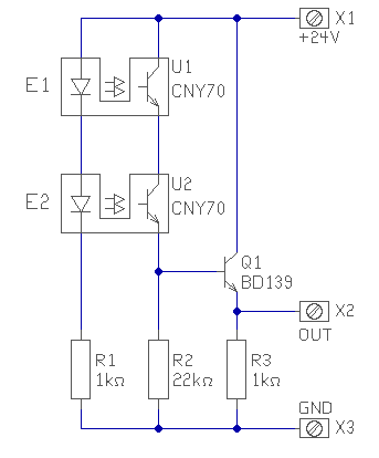 Tekintve, hogy az opto kimeneti tranzisztorainak 32V a maximális feszültsége, a két kimeneti tranzisztor sorba kapcsolásával a kívánt logikai hálózat egyszerűen megvalósítható, soros kapcsolás ÉS kaput alkot, és már meg is van, 24V feszültséggel. (Amennyiben a kiindulási logikai feltételek igazak, mert azt nem vizsgáltam..)