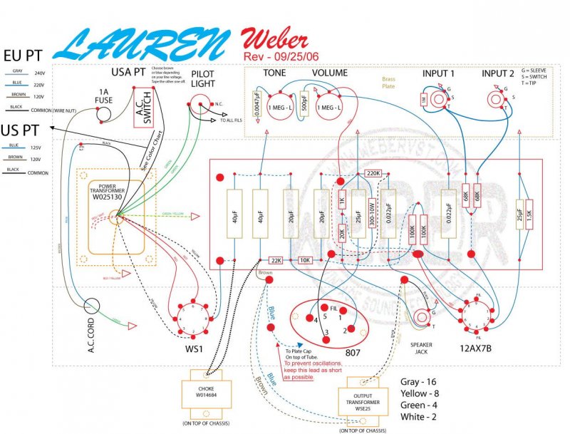 A 6p3sz az azért nem 6l6, ezt már beszéltük, kicsit óvatosabb feszültséget kér az anódja. jó az, mi egyszerűen betettük az el84 ek helyett és szólt kiválóan. 807 is jó cső, tulajdonképpen bármelyik jó én abból építenék, amelyikből valamilyen szinten van utánpótlás, persze érdekességnek meg lehet nézni a többit is. A fej kapcsolása saját, igazából nem hasonlít semmire (ha lehet ilyet mondani, erősítő fokozatok egymás után, tehát minden erősítőre hasonlít ) ,de a hangja alul fenderes, negyedtől középig vintage kihajtott marshallos, felette van halen brown soundos, 3/4 től meg atom szőrös vastag metál.A nitro tetszik, de ez nagyon metál kapcsolás lesz. Igazából ennek az előnye a nagy torzításnál, meg hard rocknál jön ki szerintem, de az a jó benne, hogy könnyen módosítható, katód ellenállás értékekkel, bypass kondikkal, a csatolókkal, osztókkal, könnyen saját ízléshez lehet hangolni. Igazából a tone stackban a mély potira menő 220nf et már sokallom is, csak a testből jövő zajokat, huppogásokat erősíti szerintem, a 22nF is bőven elég oda, vagy 47nF..de ez már privát vélemény.Meg ennek illik szerintem jó nagy tápfeszt adni, bőven 300V felett. Egyébként szimpatikus kapcsolás, biztos jól szólhat.Szerintem érdemes kipróbálni. Zsolti