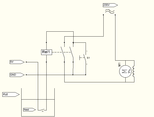 Öntartó relét kell alkalmazni. Tehát több érintkezős tipust, aminek az egyik érintkezőpárját a nyomógombbal párhuzamosan kötöd, igy annak felengedése után átveszi a szerepét,és behúzva marad. A nyomógombbal viszont sorba van a reed relé, ami megszakitja az áramkört, ha a vizszint lecsökken. Újraindulni nem tud hiába van már meg a megfelelő szint, csak ha a nyomógombot működteted.